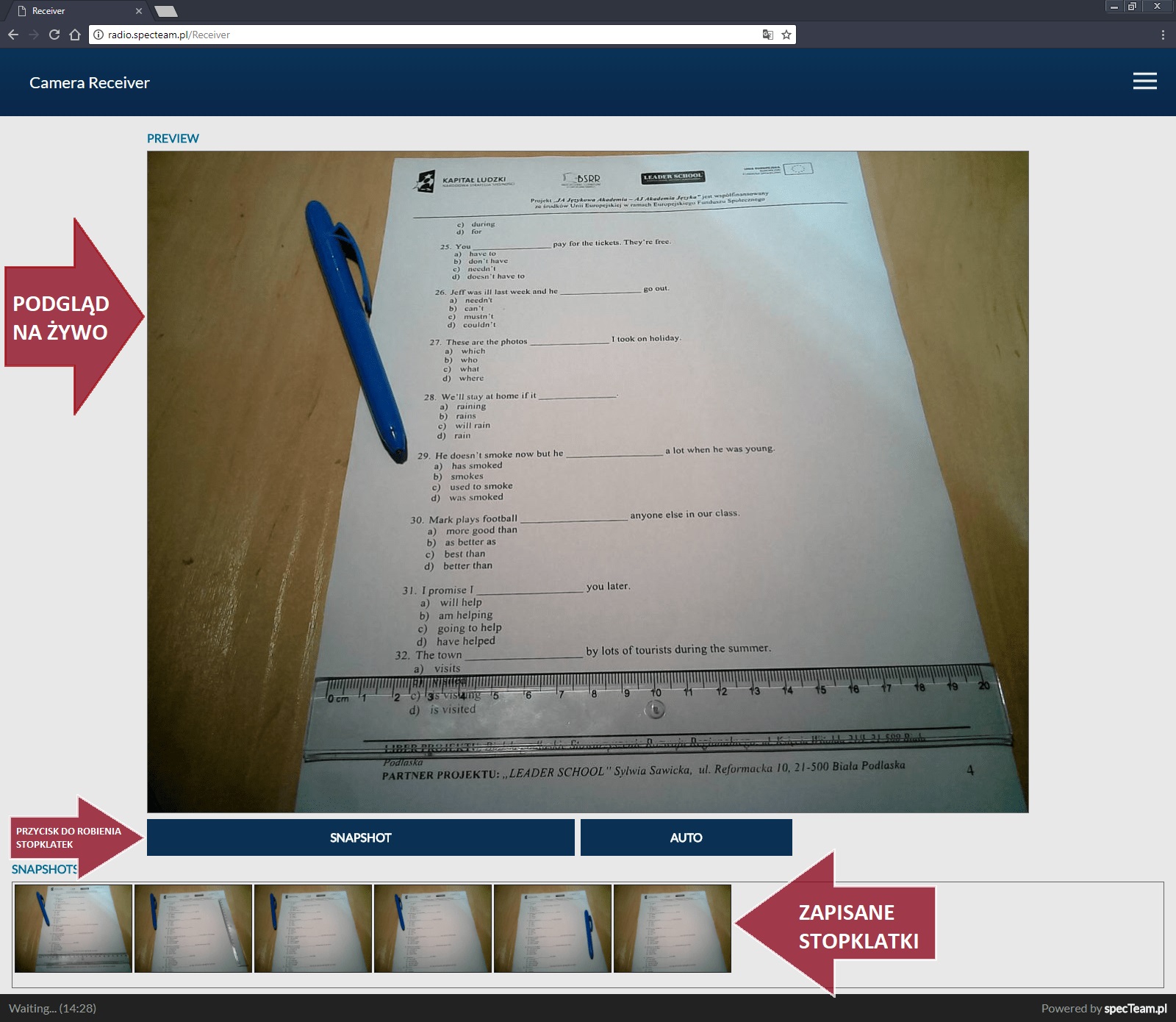 - Czy można robić stopklatki przesyłanych zdjęć?Tak. Służy do tego guzik "Snapshot" na stronie odbiornika. Zapisane stopklatki można otworzyć po kliknięciu ich miniaturki.